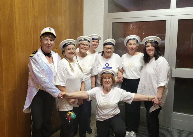 Gut gelaunt zogen beim diesjährigen kfd-Fasching 8 Matrosen ins vollbesetzte Pfarrzentrum ein. Roswitha Schweißguth, die wie jedes Jahr durchs Programm führte, stellte die Mannschaft vor: Julia Berkel, Lucia Görtz, Gerda Heene, Carmen Jacoby, Michaela Schirmer, Silke Stanek und Gabriele Tischper, und begrüßte den Musiker Timo Weber. Die närrischen Damen legten sogleich los mit dem Lied „Eine Seefahrt, die ist lustig“ und das Publikum sang direkt mit.